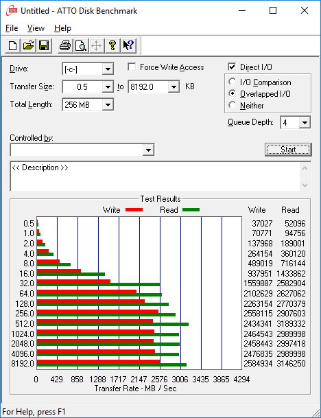 Утилита ATTO Disk Benchmark определяет максимальную скорость последовательного чтения RAID-массива на уровне 3000 МБ/с, а скорость последовательной записи — на уровне 2500 МБ/с. На сегодняшний день это рекордно высокий результат.