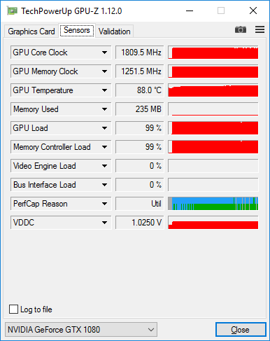 При отключенном режиме SLI частота графического процессора в режиме стрессовой загрузки немного выше — 1809-1860 МГц.