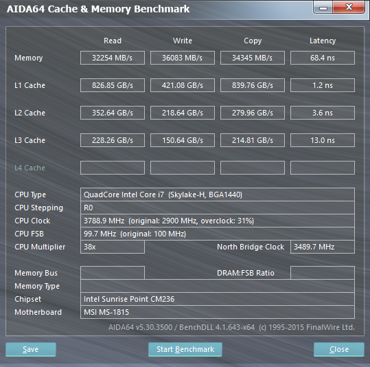 Согласно данным утилиты AIDA64 Cache & Memory Benchmark, скорость записи данных в память составляет 36083 МБ/с, а скорость чтения — 32254 МБ/с. Для памяти DDR4-2400 в двухканальном режиме работы это вполне типичные показатели.