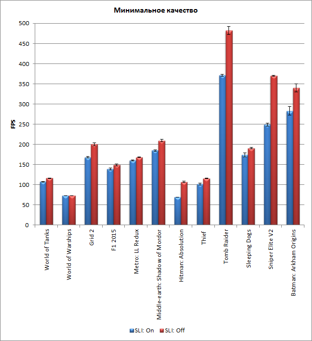 Более наглядно полученные результаты тестирования можно представить на двух диаграммах. Как видим, при настройке игр на минимальное качество (хотя, повторимся, в случае ноутбука MSI GT83VR 6RF-018RU Titan SLI такой режим не имеет никакого практического значения) использование SLI приводит к проигрышу в производительности во всех играх. При настройке на максимальное качество есть игры, в которых режим SLI позволяет повысить производительность, но есть и игры, в которых использование режима SLI приводит к падению производительности.