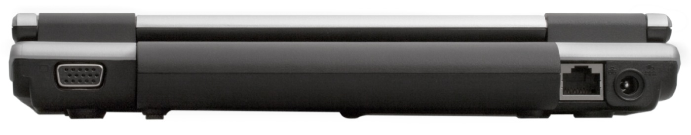 Задняя панель у MSI тоже чистая, как у всех ноутбуков, где матрица откидывается назад, она занята только батареей. У ASUS сзади выход на внешний монитор, проводную сеть, питание и порт замка Кенсингтона. Теоретически все правильно – если нетбук стоит на столе, то все основные (и толстые) кабели будут за ним, а не торчать с боков, это более эстетично и эргономично. Однако на практике есть один недостаток – если вы хотите взять нетбук со стола, то вам нужно прикрыть матрицу, встать, залезть за нее и отцепить все эти кабели. Если кабель сбоку, то отсоединить его гораздо проще. А ведь нетбук – по определению портативная модель, которую берут с собой. У Toshiba с одного бока расположен выход на монитор, с другого – разъем для проводной сети и питания. Здесь действуют те же замечания, что и для ASUS, но в Toshiba разъем питания расположен с краю, т.е. штекер можно воткнуть наощупь сбоку.