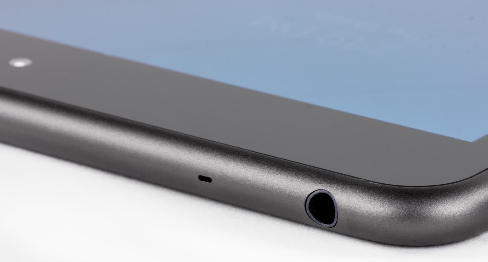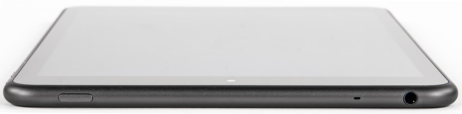 Боковое ребро планшета симметрично закруглено. Сверху находится разъем для наушников и микрофон.