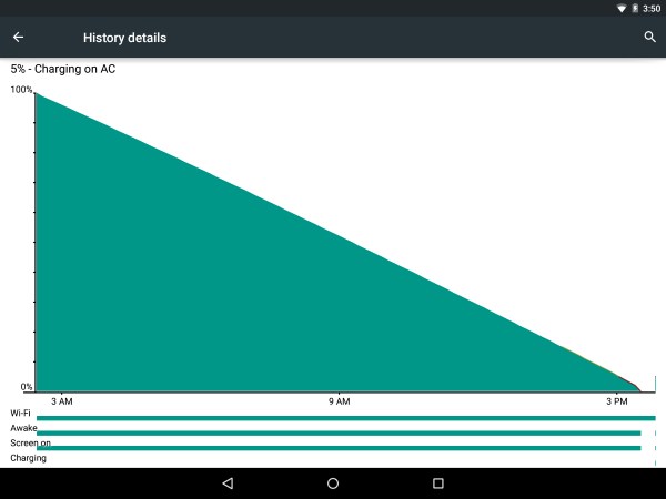 В Nokia N1 установлена батарея емкостью 5300 мА·ч. График разряда прямой практически на всем протяжении: