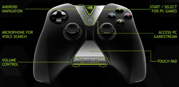 Вторым гвоздем программы стал геймпад, созданный Nvidia специально для планшета Shield и совместимый только с ним, а также с ПК. Геймпад выглядит, на первый взгляд, достаточно стандартно: справа и слева от центра размещены два аналоговых джойстика (во время игры один из них, как правило, отвечает за движение персонажа, а другой — за положение камеры), D-pad (слева), кнопки A/B/X/Y (справа).