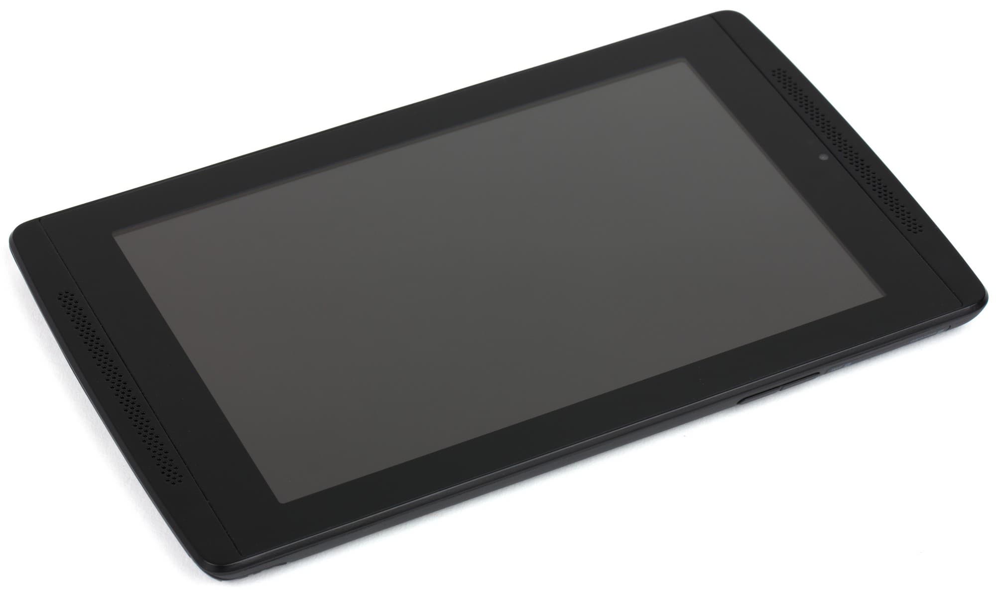 Лицевая поверхность экрана выполнена в виде стеклянной пластины с зеркально-гладкой поверхностью, устойчивой к появлению царапин. Судя по яркости отраженных объектов, антибликовые свойства экрана хуже, чем у Google Nexus 7 (2013) (далее просто Nexus 7). Для наглядности приведем фотографию, на которой в выключенных экранах обоих планшетов отражается белая поверхность (Nvidia Tegra Note 7 — справа, далее их можно различать по размеру области отображения, которая больше из-за убираемых экранных кнопок, и на всех сравнительных фотографиях ниже тестируемый планшет расположен над Nexus 7):