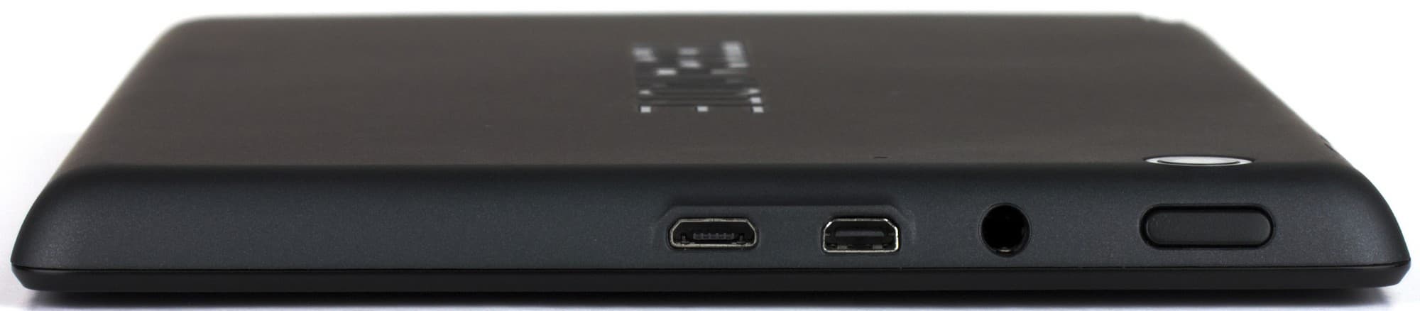 А на левой грани расположилась кнопка питания (довольно тугая, нажимается с хорошо слышным звуком) и все разъемы: Micro-USB, Micro-HDMI и гнездо 3,5 мм для гарнитуры. Micro-USB поддерживает подключение внешних накопителей по интерфейсу OTG. Что касается Micro-HDMI, то это еще один минус устройства по сравнению с Nvidia Shield Tablet, где был Mini-HDMI. Дело в том, что кабели и сами разъемы Micro-HDMI крайне недолговечны, в отличие от более надежных Mini-HDMI.