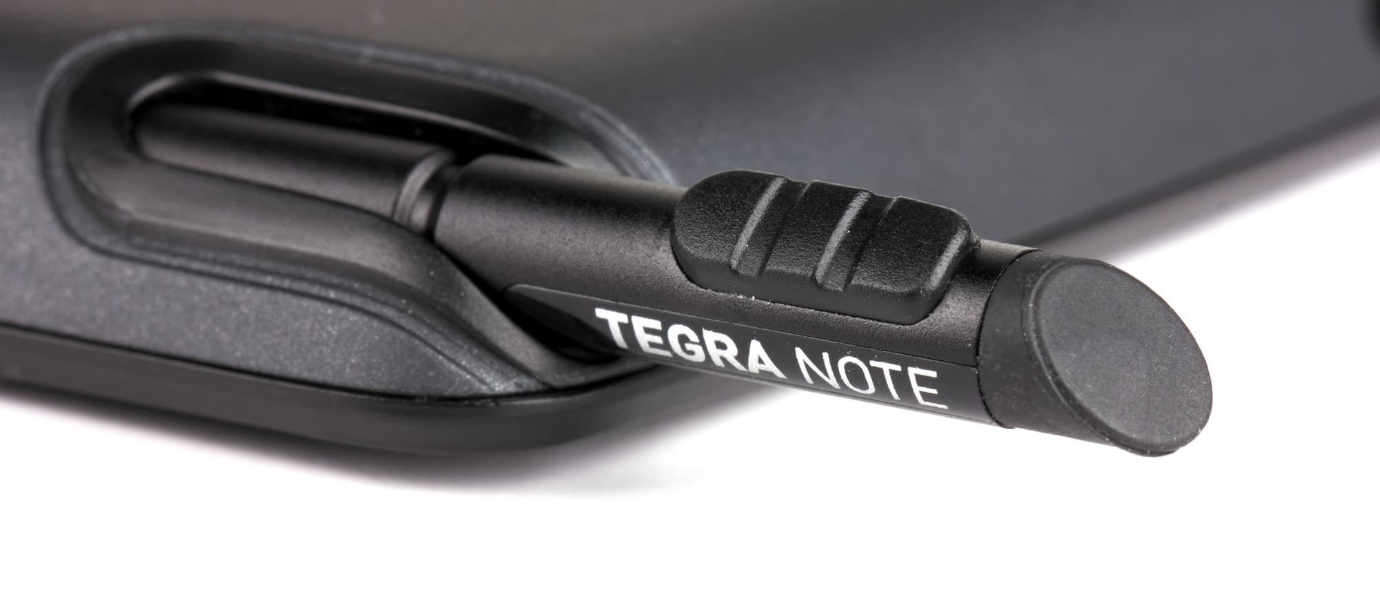 Задняя поверхность имеет покрытие из матового пластика типа soft-touch. В центре выдавлена марка устройства — Tegra Note. В правом верхнем углу — глазок камеры, а под ним — отверстие микрофона. Грани — скошены с задней поверхности. На верхней грани (в том углу, что около камеры) мы видим слоты для SIM-карты и microSD, защищенные заглушкой. Рядом — кнопки регулировки громкости (пластиковые, довольно упругие).