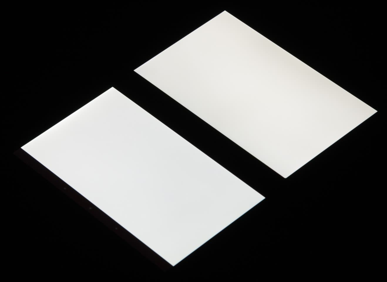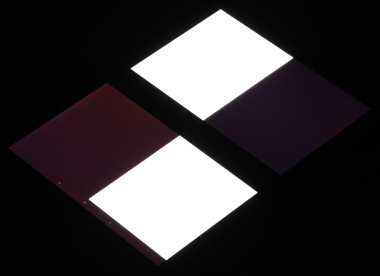 Яркость под углом у обоих планшетов заметно уменьшилась (как минимум в 5 раз, исходя из разницы в выдержке), и уменьшилась примерно одинаково. Черное поле при отклонении по диагонали высветляется слабо, и приобретает фиолетовый или красно-фиолетовый оттенок. Фотография с Nexus 7 для сравнения это показывает (яркость белых участков в перпендикулярном направлении у обоих планшетов примерно одинаковая!):