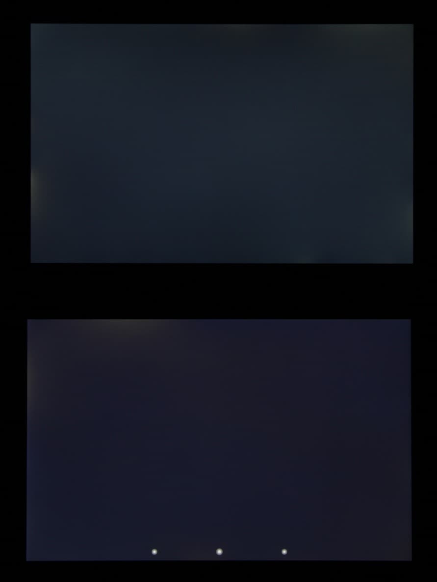 При перпендикулярном взгляде равномерность черного неидеальная, так как по краю в нескольких местах есть участки с немного с повышенной яркостью черного:
