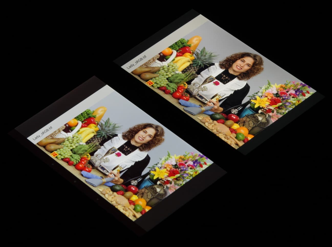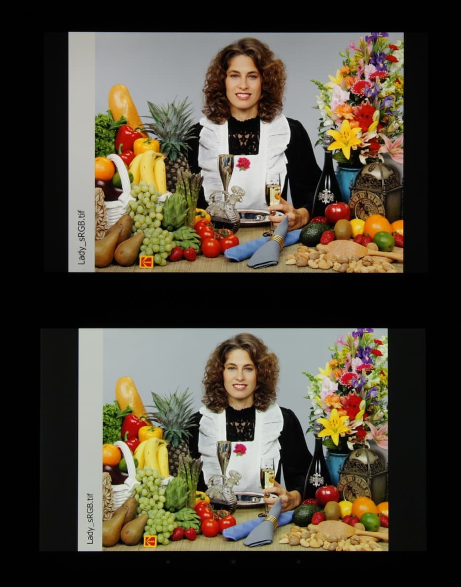 Цветопередача хорошая у обоих экранов, цветовой баланс различается незначительно. При выборе профиля Исходный характер изображения чуть-чуть меняется:
