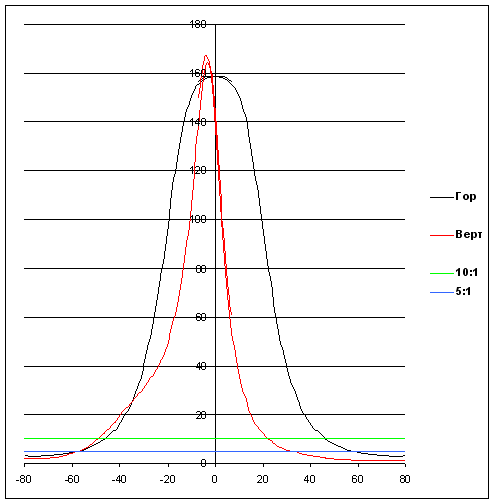 Зависимость контрастности (отношения яркости белого поля к яркости черного) в центре экрана от отклонения оси датчика (отрицательные значения — влево или вниз, положительные значения — вправо или вверх) от нормали к экрану в вертикальной и горизонтальной плоскостях. Зеленая линия — отношение 10:1, голубая — 5:1