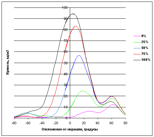 перпендикуляра к экрану, мы провели серию измерений яркости черного,