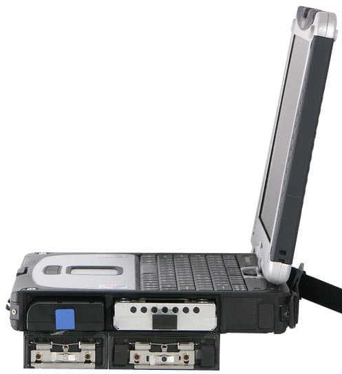 Справа — отсеки аккумуляторной батареи и жесткого диска. Контейнер жесткого диска заполнен специальным гелем, смягчающим удары и вибрации. Вообще говоря, ноутбук разработан в соответствии с требованиями стандарта MIL STD 810F (подробнее о стандарте можно прочитать, например, здесь) и должен выдерживать падение с высоты 90 см, а возможность быстрой замены диска — на случай, если высота окажется больше :).