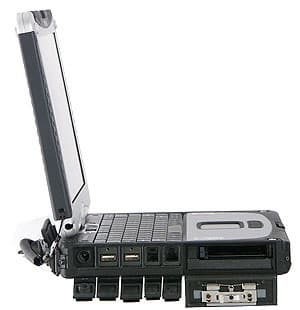 Стоит отметить, что в настоящее время модель оснащается процессором Pentium M ULV 713 с тактовой частотой 1.1 GHz и контроллером беспроводной сети Intel PRO/Wireless 2200BG. Модель выпускается в двух вариантах — с чувствительным к нажатию экраном (Touchscreen PC version) и с «обычным» для Tablet PC экраном с электромагнитным пером. На мой субъективный взгляд, для экстремальных условий больше подходит Touchscreen — в него, в конце концов, можно и пальцем ткнуть. Именно такая модель побывала у нас на тестировании.