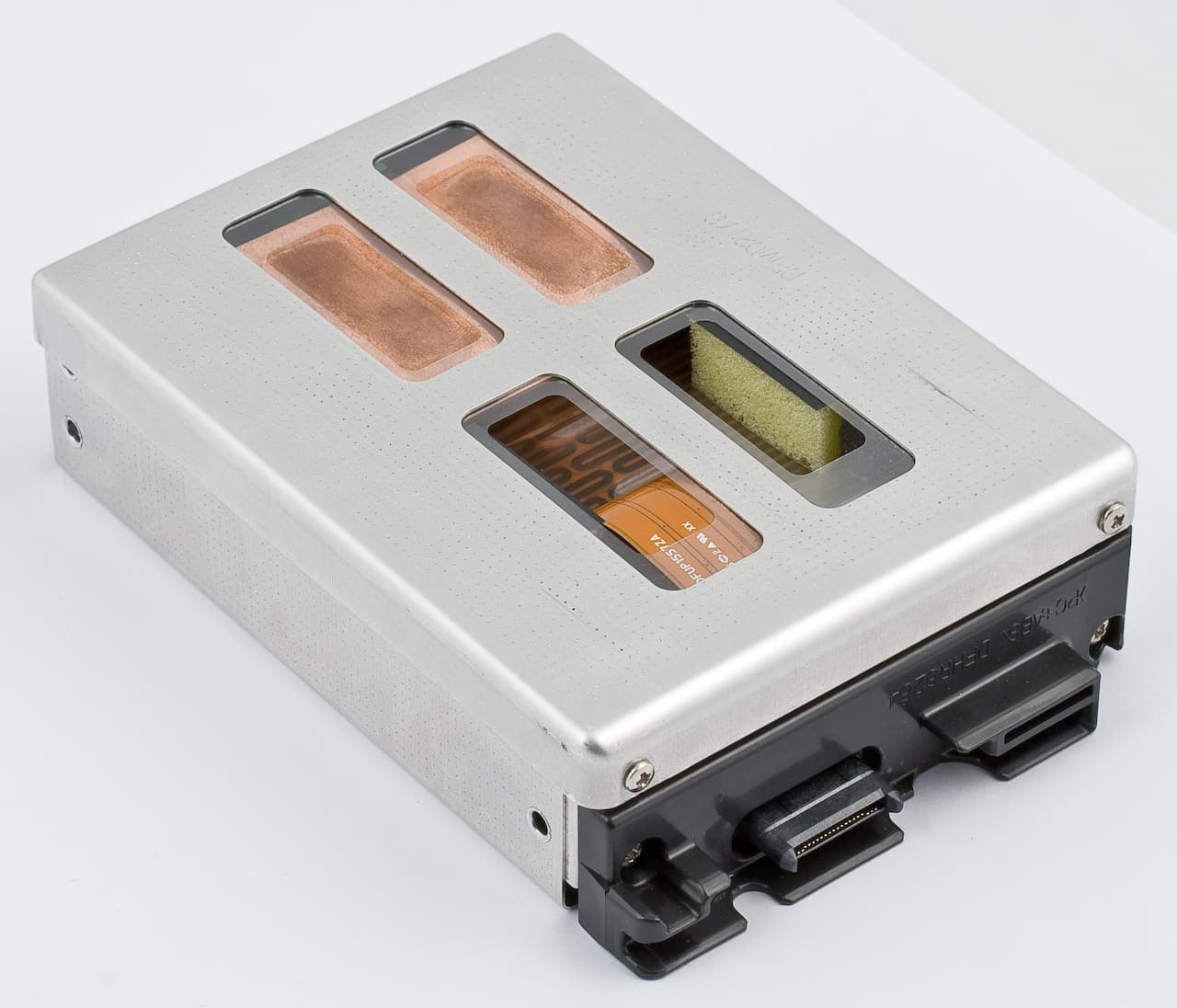 Отдельно стоит обратить внимание на систему защиты жесткого диска. Он упакован в специальный металлический контейнер, а внутри него удерживается в жестких вставках (что-то среднее между пенопластом и поролоном), который абсорбирует удары и вибрации, защищая жесткий диск. К тому же, контейнер оснащен системой подогрева — если работать с ноутбуком на морозе, жесткий диск будет подогреваться и останется в пределах температуры, указанных производителем.