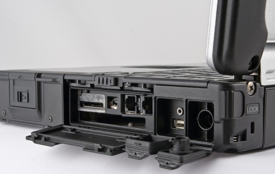 Перед тем, как мы перейдем к описанию расположения разъемов на корпусе, стоит подробнее рассказать об их защите. Как уже отмечалось, эргономика при проектировании этого ноутбука поставлена во главу угла. Поэтому те порты, которые могут понадобиться при работе в поле, прикрыты мягкими резиновыми крышками — их легко открыть и закрыть. При этом сами порты утоплены достаточно глубоко в корпус, так что влаге достаточно трудно попасть на них даже при открытой крышке. К тому же, порты как бы «подняты» в углублении и расположены достаточно далеко от нижней грани, где может скапливаться вода.