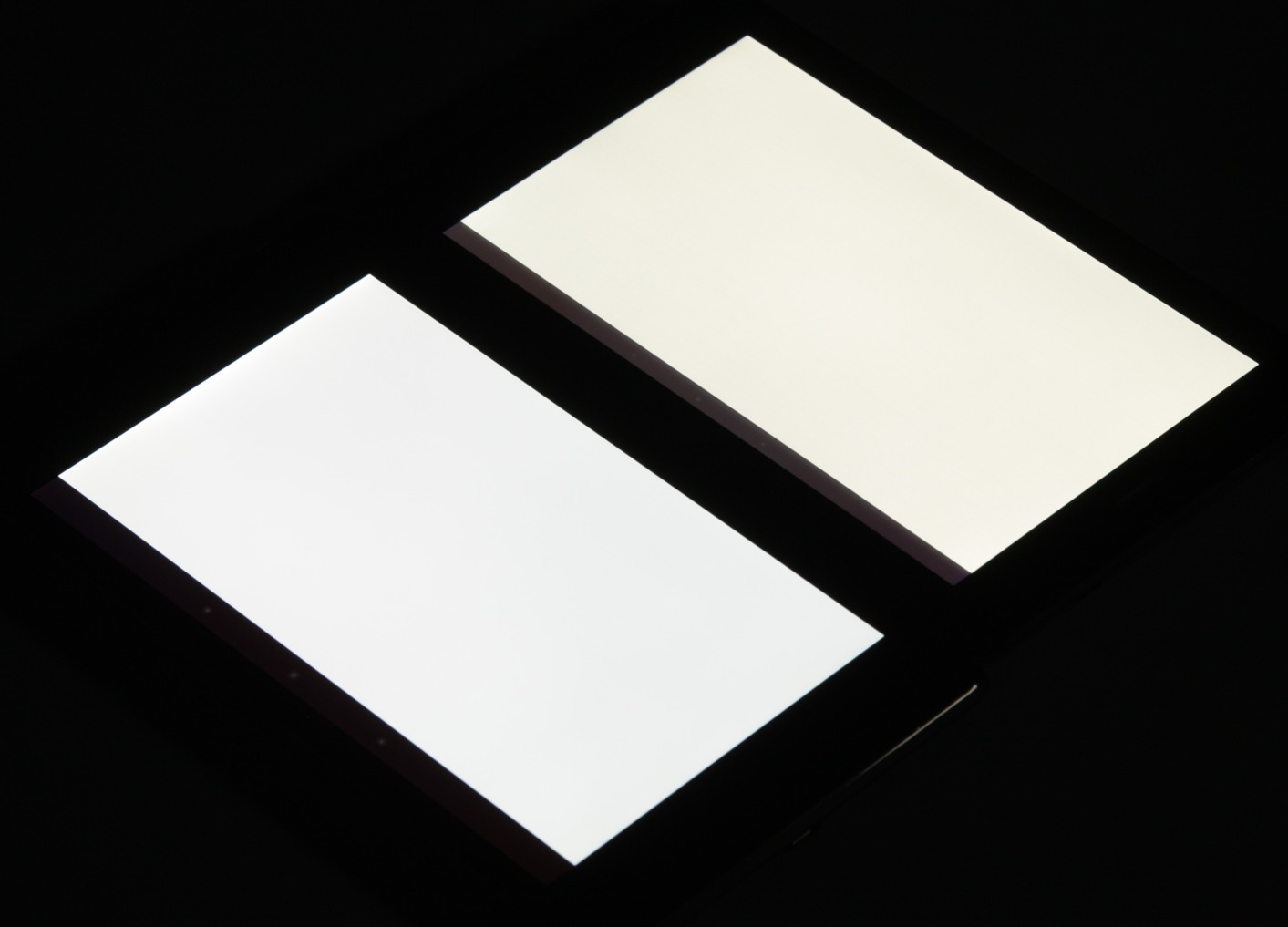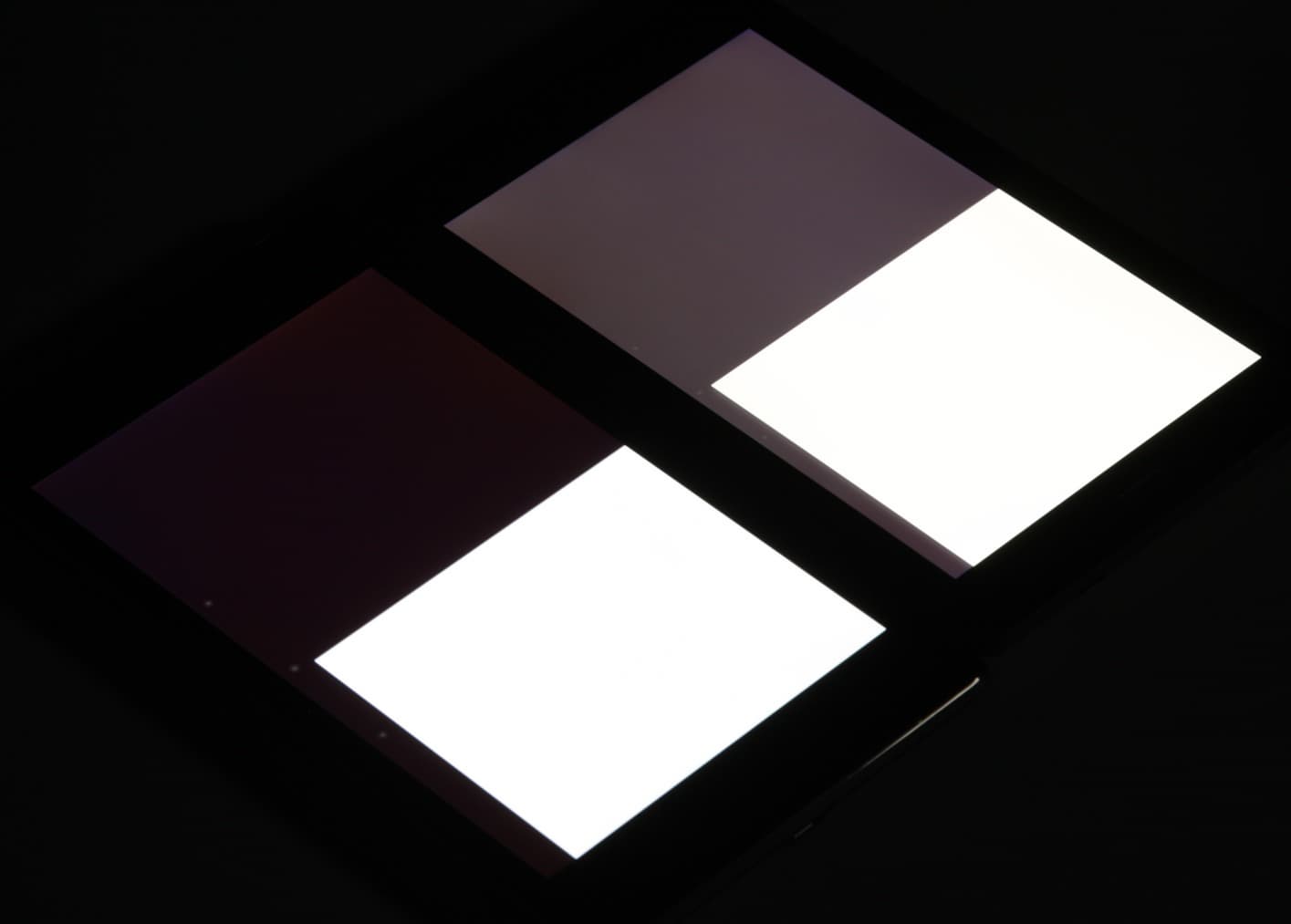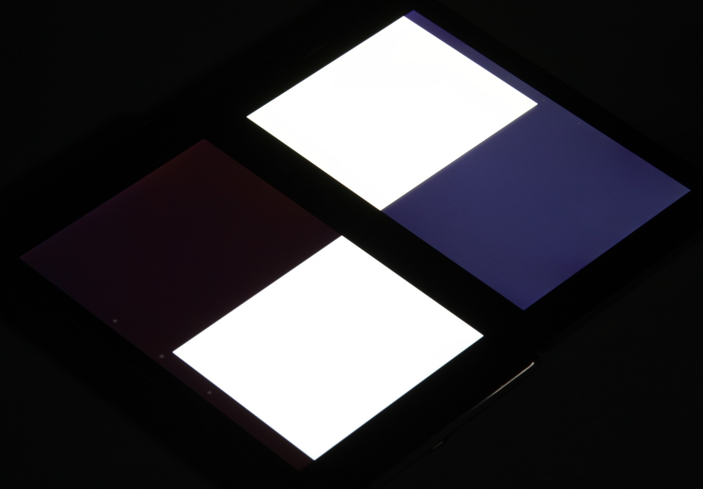 Яркость под углом у обоих планшетов заметно уменьшилась (как минимум в 5 раз, исходя из разницы в выдержке), но у Nexus 7 экран под эти углом все же немного светлее. При этом цветовой тон изменился незначительно. Черное поле при отклонении по диагонали высветляется очень сильно и приобретает фиолетовый или красно-фиолетовый оттенок. Фотография с Nexus 7 для сравнения это показывает (яркость белых участков в перпендикулярном направлении у обоих экранов одинаковая!):