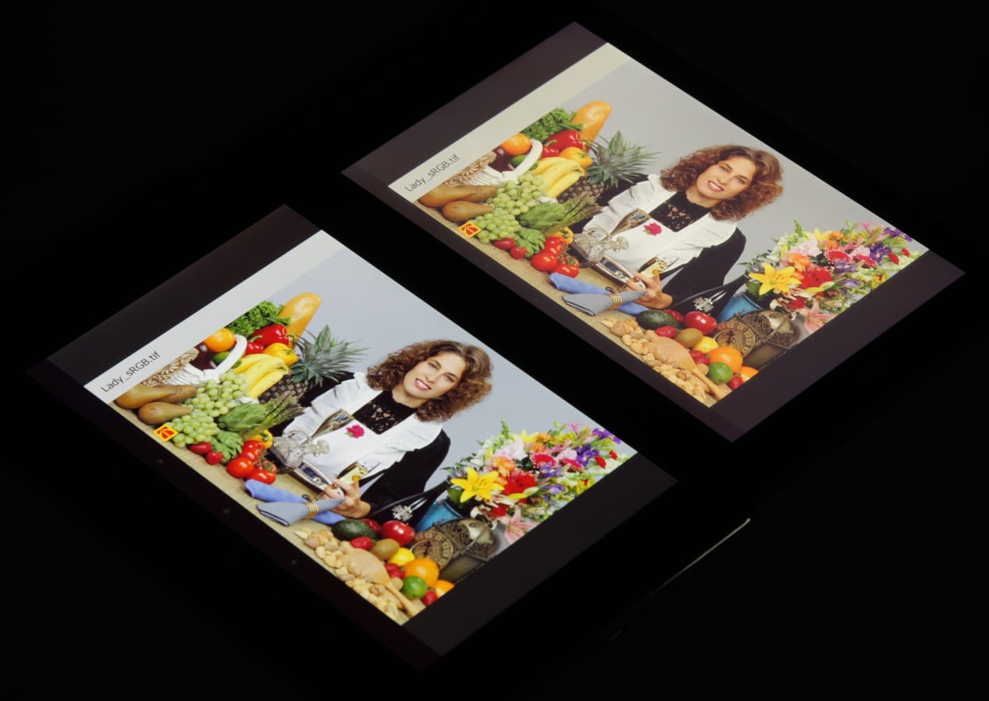 Экран имеет хорошие углы обзора без инвертирования оттенков и без значительного сдвига цветов даже при больших отклонениях взгляда от перпендикуляра к экрану. Для сравнения приведем фотографии, на которых на экраны Nexus 7 и тестируемого планшета (напомним, он сверху) выведены одинаковые изображения, при этом яркость обоих экранов установлена примерно на 200 кд/м². Перпендикулярно к экранам тестовая картинка: