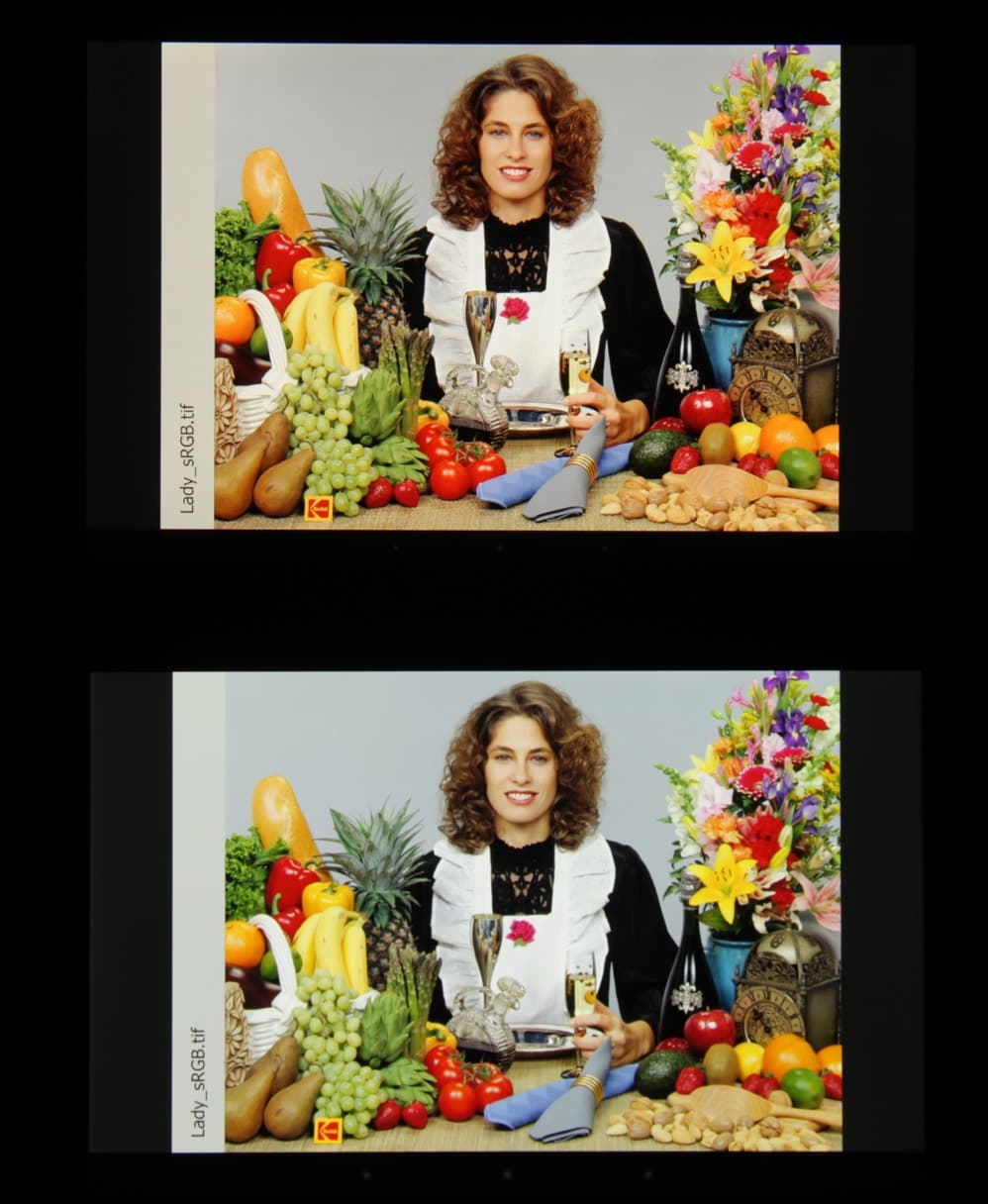 Данный прием позволяет увеличить яркость экрана при тех же затратах энергии на подсветку. Впрочем, насыщенность уменьшена только у зеленого цвета, да и то на не очень большую величину. В итоге цвета изображений — рисунков, фотографий и фильмов, — ориентированных на пространство sRGB (а таких подавляющее большинство), имеют насыщенность, близкую к естественной. Баланс оттенков на шкале серого хороший, так как цветовая температура не сильно ниже стандартных 6500 К и отклонение от спектра абсолютно черного тела (ΔE) меньше 10, что для потребительского устройства считается приемлемым показателем. При этом цветовая температура и ΔE мало изменяются от оттенка к оттенку, что хорошо сказывается на визуальной оценке цветового баланса. Самые темные области шкалы серого можно не учитывать, так как там баланс цветов не имеет большого значения, да и погрешность измерений цветовых характеристик на низкой яркости большая.