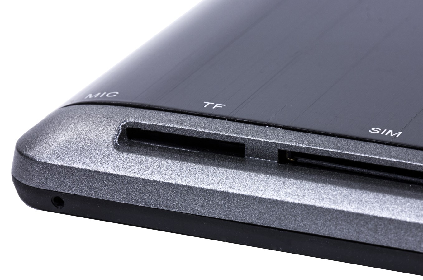 Внизу словно бы вырублены подпружиненные слоты для карты памяти и SIM. Рядом в углу находится микрофон. Серая рамка планшета представляет собой цельную деталь.