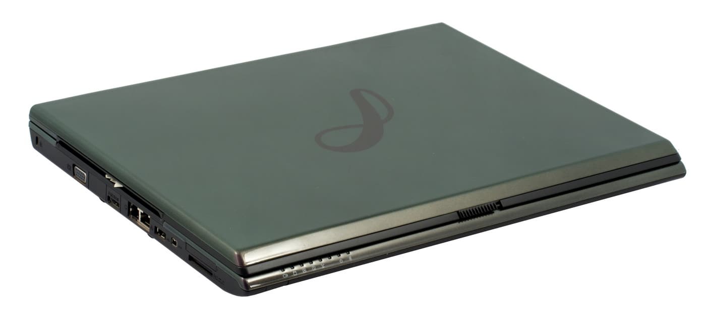 Дизайн корпуса чем-то (только не спрашивайте, откуда возникла такая ассоциация) напоминает по дизайну футуристические космические корабли в фильмах восьмидесятых годов. Сам ноутбук сурово прямоугольный, лишь чуть-чуть скруглены углы. Зато передняя панель предстает во всем великолепии. Она скошена вперед, и между двумя крашеными в хамелеон деталями проходит линия простой черной пластмассы, на которой находится ползунок замка крышки. Нижняя крышка ноутбука плоская и выполнена из обычной черной матовой пластмассы, выглядящей, прямо скажем, простовато. На столе ноутбук стоит на достаточно высоких ножках, видимо, чтобы лучше охлаждалось дно. Кстати, из-за этого его неудобно держать на коленях.