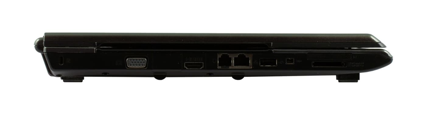 На левой грани расположены аналоговый выход на внешний монитор или проектор, порт HDMI, модемный и сетевой разъемы, порт USB 2.0, порт FireWire. Совсем близко к передней панели расположены слот Expresscard и картовод.