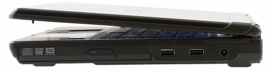 На правой грани расположен оптический привод (удобно работать с ним правой рукой), два порта USB, достаточно далеко разнесенные, и слот питания. Штекер питания Г-образный, поэтому провод уходит за ноутбук, а не лежит на столе около мышки.