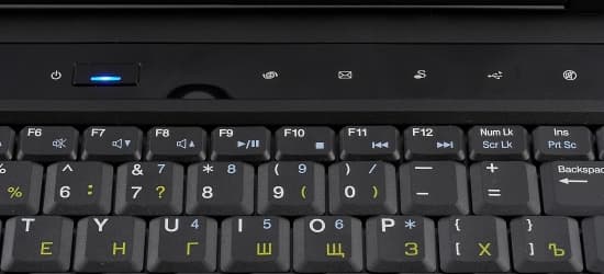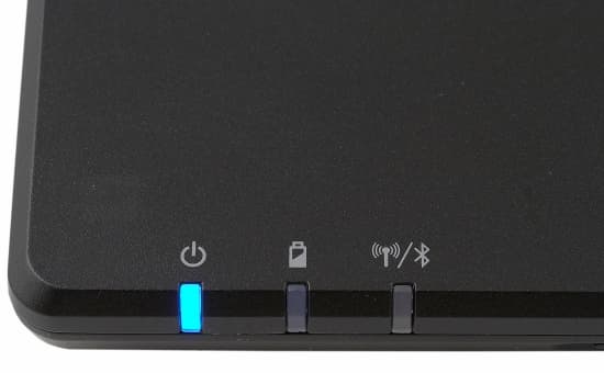 У ноутбука стандартные две группы индикаторов. Первая расположена на левом углу клавиатурной панели, состоит из трех индикаторов, светящихся ярким голубым светом.