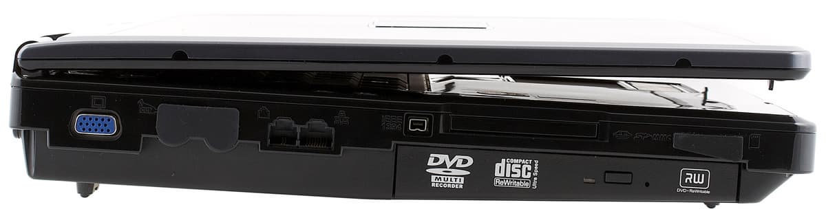 Наконец, на правой стороне корпуса расположены: выход на внешний монитор, выход S-video, разъем для антенны ТВ-тюнера (они прикрыты резиновыми крышечками), модемный и сетевой порты, порт FireWire, слот Expresscard и универсальный картовод, а под ними — комбинированный привод, поддерживающий все вплоть до Blu-ray