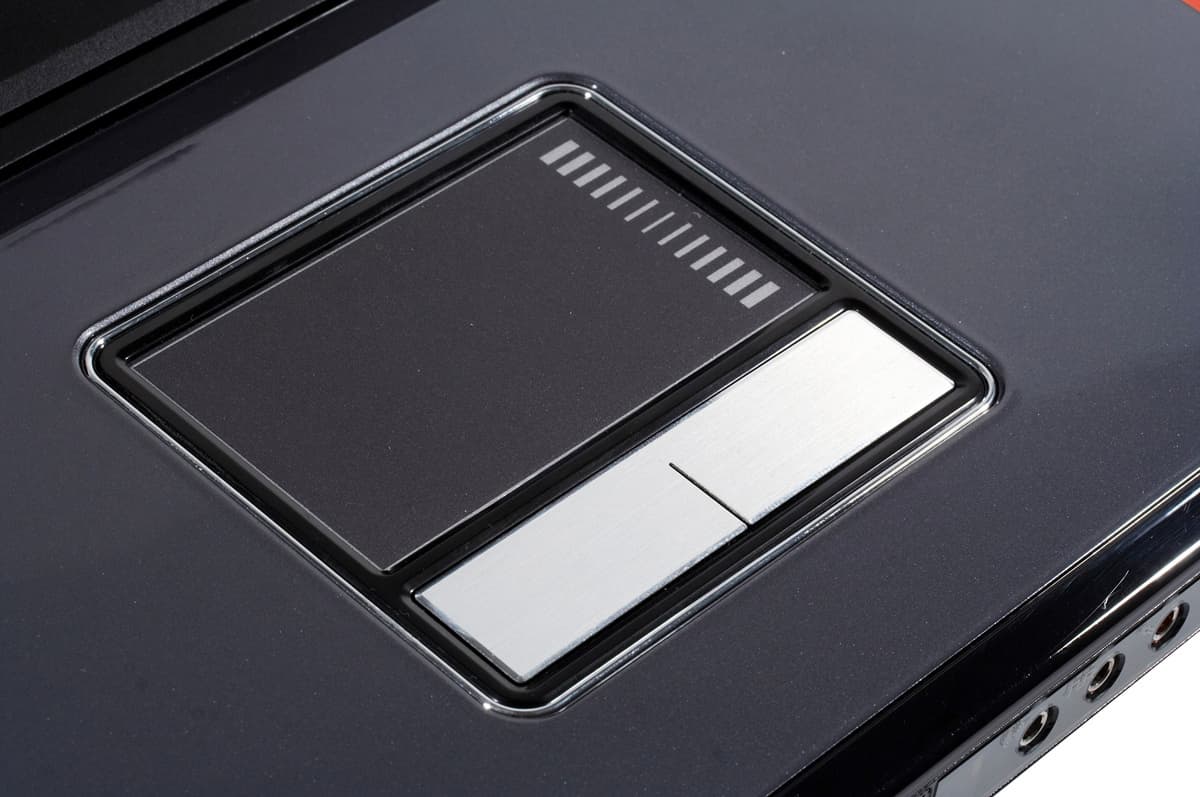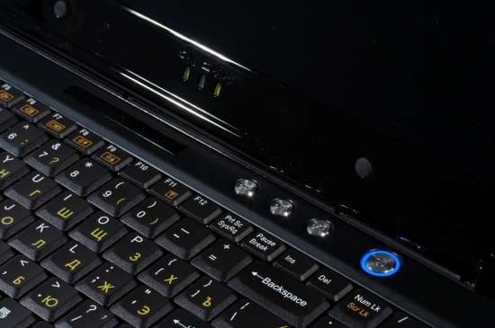 Рабочие индикаторы сосредоточены под стеклянной вставкой над клавиатурой ноутбука. Индикаторы выполнены в виде прозрачных рисунков на черной поверхности, которые снизу подсвечиваются зелеными светодиодами.
