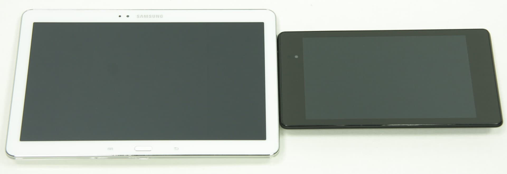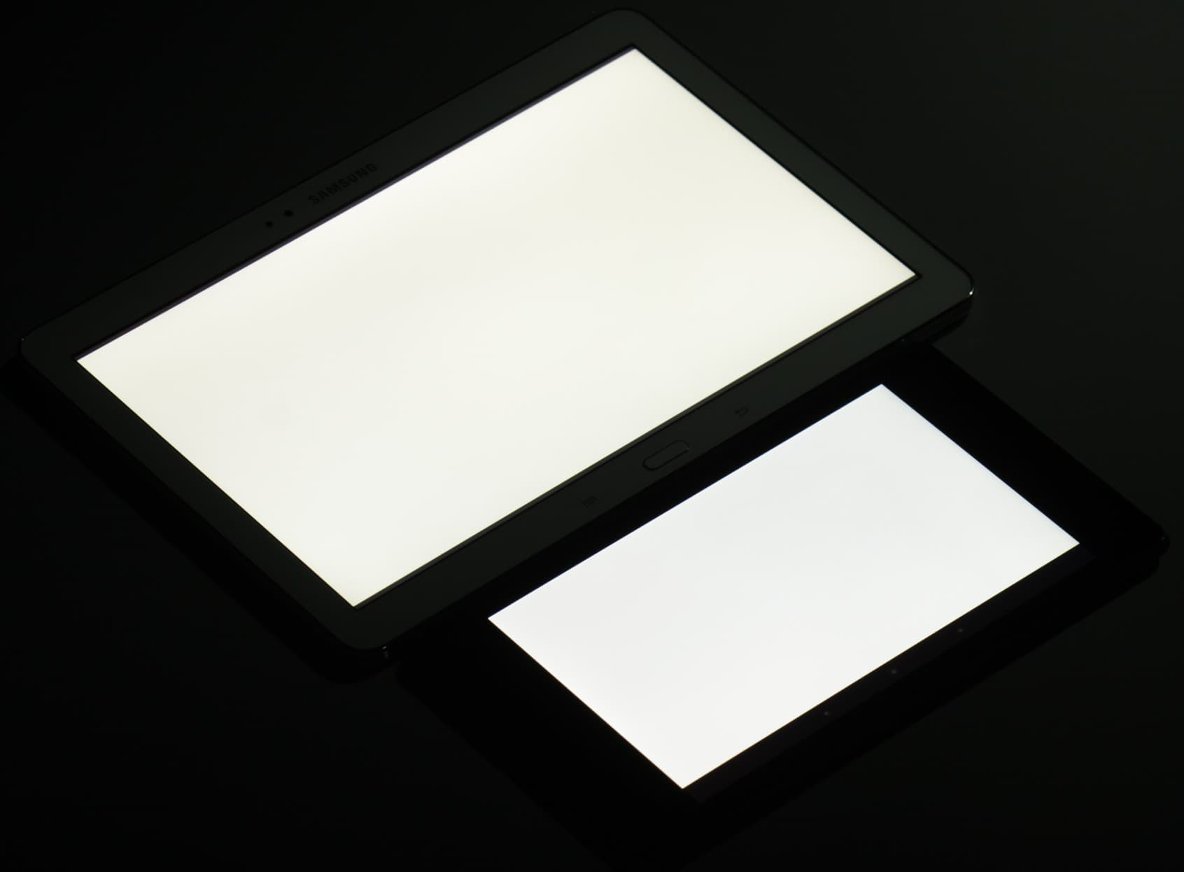 Экран имеет хорошие углы обзора без инвертирования оттенков и без значительного сдвига цветов даже при больших отклонениях взгляда от перпендикуляра к экрану. Для сравнения приведем фотографию, на которой на экраны Google Nexus 7 и SM-P601 выведены одинаковые изображения, при этом яркость обоих экранов установлена примерно на 200 кд/м², и снимок сделан под углом примерно 45 градусов к плоскости и к стороне экрана. Сначала просто белое поле: