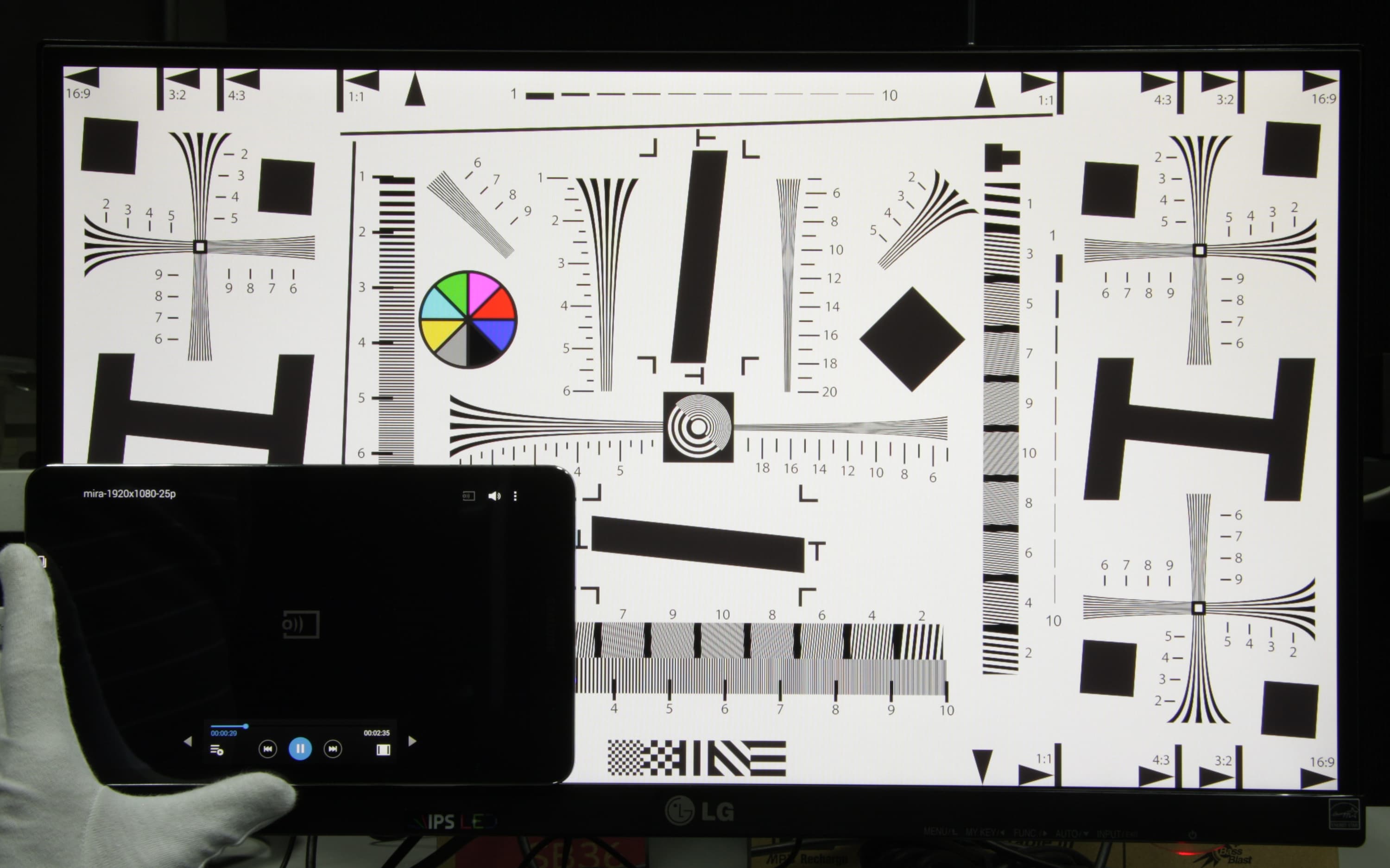 При воспроизведении видеофайлов с разрешением FullHD (1920×1080 пикселей) на экране монитора изображение собственно видеофайла выводится точно по границе экрана с сохранением истинных пропорций и разрешение соответствует разрешению FullHD. Отображаемый на мониторе диапазон яркости равен стандартному диапазону 16—235, то есть в тенях и в светах отображаются все градации оттенков. Отметим, что штатный плеер не воспроизвел наши тестовые файлы с разрешением 4К, а MX Player не умеет выводить видео на всю область отображения монитора. Второе мы посчитали более критичным, а потому тестирование вывода видео на внешний монитор проводилось с использованием именно штатного плеера. Результаты тестов вывода на монитор приведены в таблице выше в блоке «MHL (вывод на монитор)». Качество вывода хорошее, но немного хуже, чем на собственный экран, что можно объяснить сменой плеера.