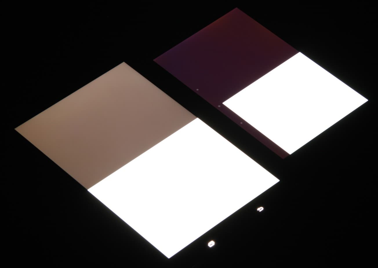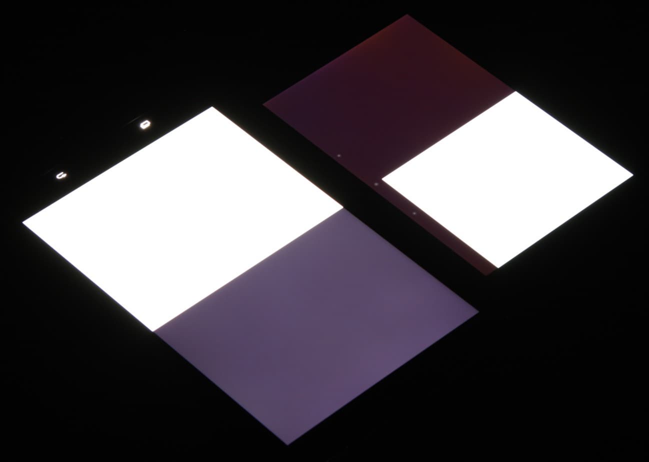 Видно, что цвета не сильно изменились у обоих экранов, но контраст под углом в случае Tab Pro 8.4 резко снизился из-за увеличения яркости черного поля. И белое поле: