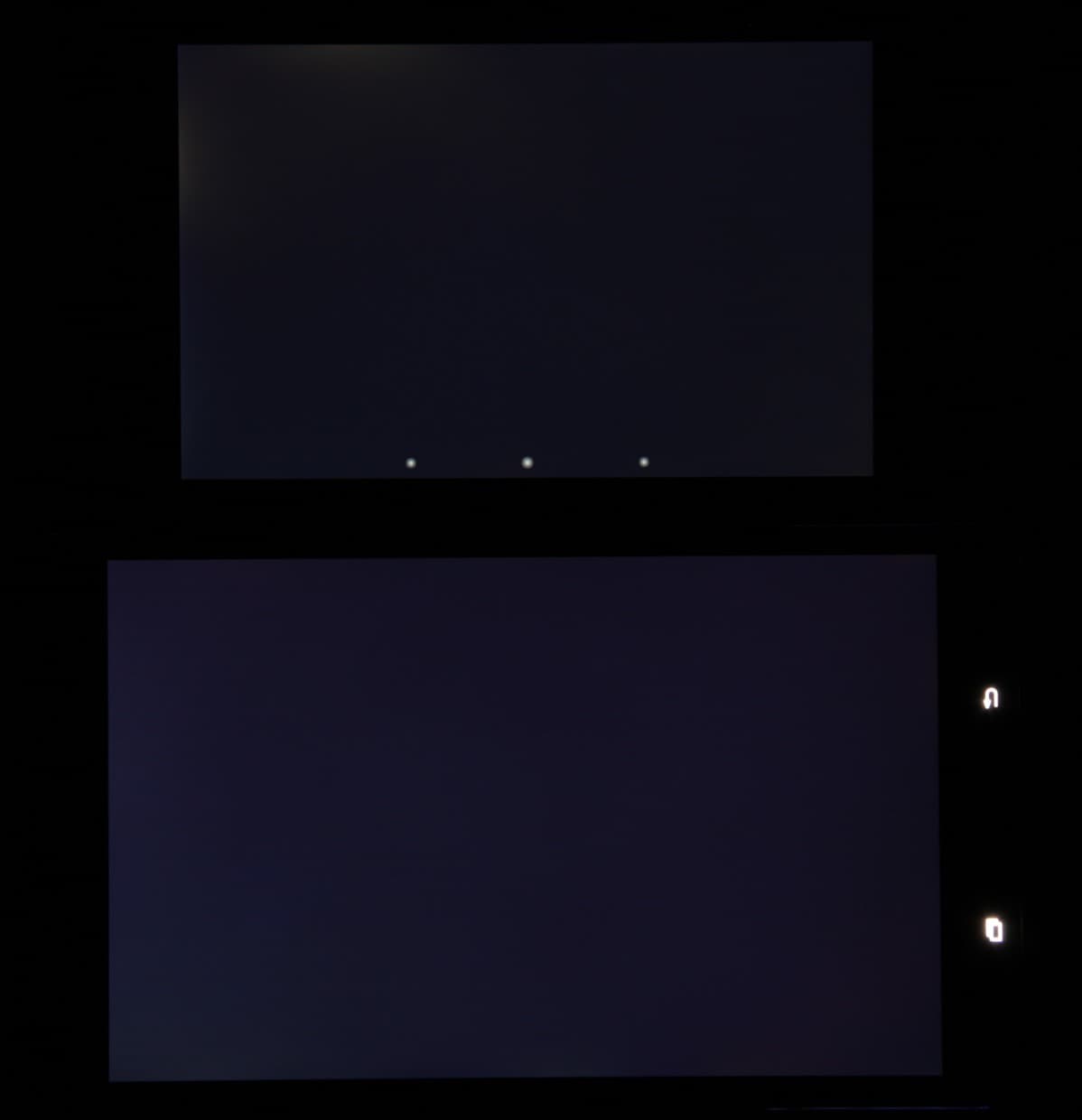 При перпендикулярном взгляде равномерность черного поля хорошая. Углы экрана по яркости различаются, но нет локальных засвеченных участков, что для визуальной оценки равномерности важнее: