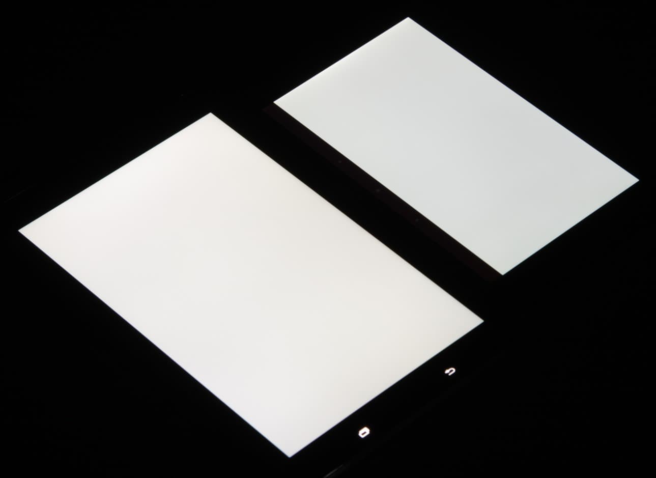 Экран имеет хорошие углы обзора без инвертирования оттенков и без значительного сдвига цветов даже при больших отклонениях взгляда от перпендикуляра к экрану. Для сравнения приведем фотографии, на которой на экраны Nexus 7 и Tab Pro 8.4 выведены одинаковые изображения, при этом яркость обоих экранов установлена примерно на 200 кд/м². Перпендикулярно к плоскости экранов белое поле: