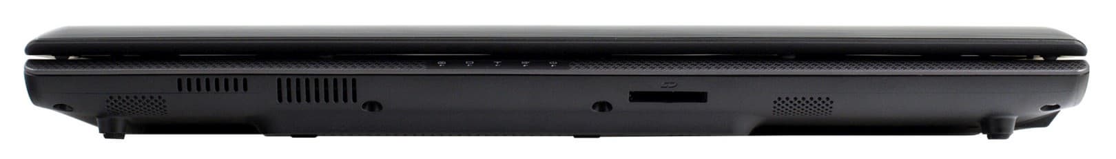 Индикаторы расположены тут же, у нижней грани, и светят аналогично подсветке тачпада приглушенно-синим светом за исключением зеленого светодиода, сигнализирующего о наличии внешнего питания. Функция последнего, кстати, достаточно странная, уместно было бы, чтобы он контролировал процесс зарядки батареи (и отключался, когда она полностью заряжена, как в других ноутбуках), что полезно, когда ноутбук подключается к сети с целью зарядки батареи. Но в данном случае, светодиод светит постоянно, когда ноутбук подключен к внешнему питанию, а понять зарядилась ли батарея можно, только включив сам ноутбук... или перевернув его, чтобы нажать кнопку-индикатор, предусмотренную на корпусе самой батареи.