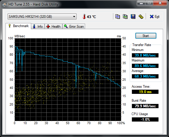 Диски производства Samsung не так часто встречаются в ноутбуках от других производителей, но для собственной модели, конечно, компания заинтересована использовать по-максимуму оригинальные компоненты. Как мы видим, результаты вполне соответствуют уровню современных моделей от Hitachi и Toshiba.
