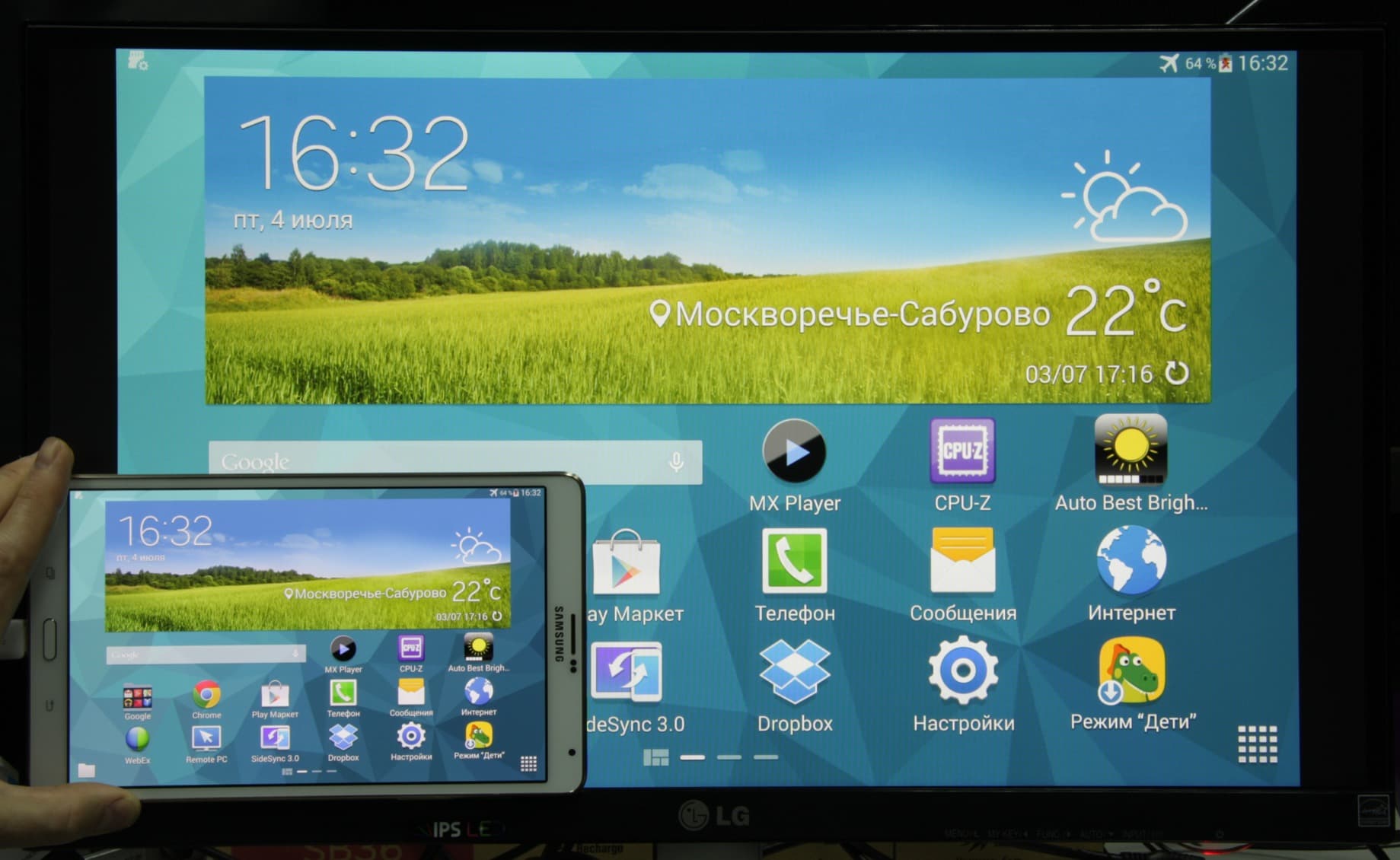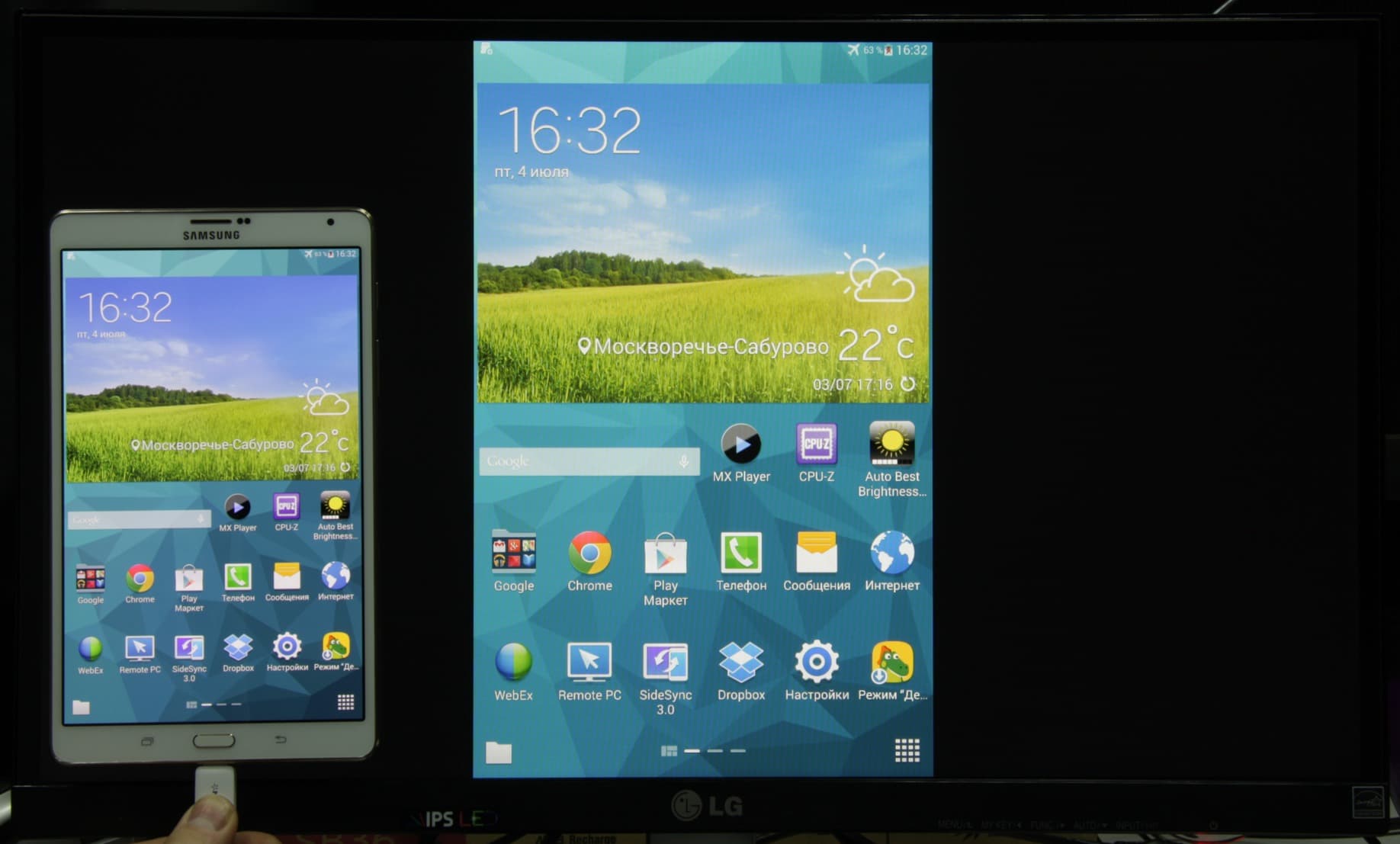 В данном случае тест мы проводили с помощью фирменного адаптера от Samsung, при этом вывод по MHL осуществлялся в разрешении 1920 на 1080 пикселей с частотой 60 кадр/с. При портретной ориентации планшета вывод изображения на экран монитора осуществляется тоже в портретной ориентации, при этом изображение на мониторе вписано в границы экрана по высоте, а справа и слева выводятся широкие черные поля: