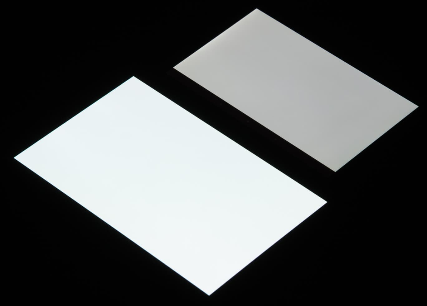 Лицевая поверхность экрана выполнена в виде стеклянной пластины с зеркально-гладкой поверхностью, устойчивой к появлению царапин. Судя по отражению объектов, антибликовые свойства экрана может чуть хуже, чем у экрана Google Nexus 7 (2013) (далее просто Nexus 7). Для наглядности приведем фотографию, на которой в выключенных экранах отражается белая поверхность (слева — Nexus 7, справа — Samsung Galaxy Tab S 8.4, далее их можно различать по размеру):