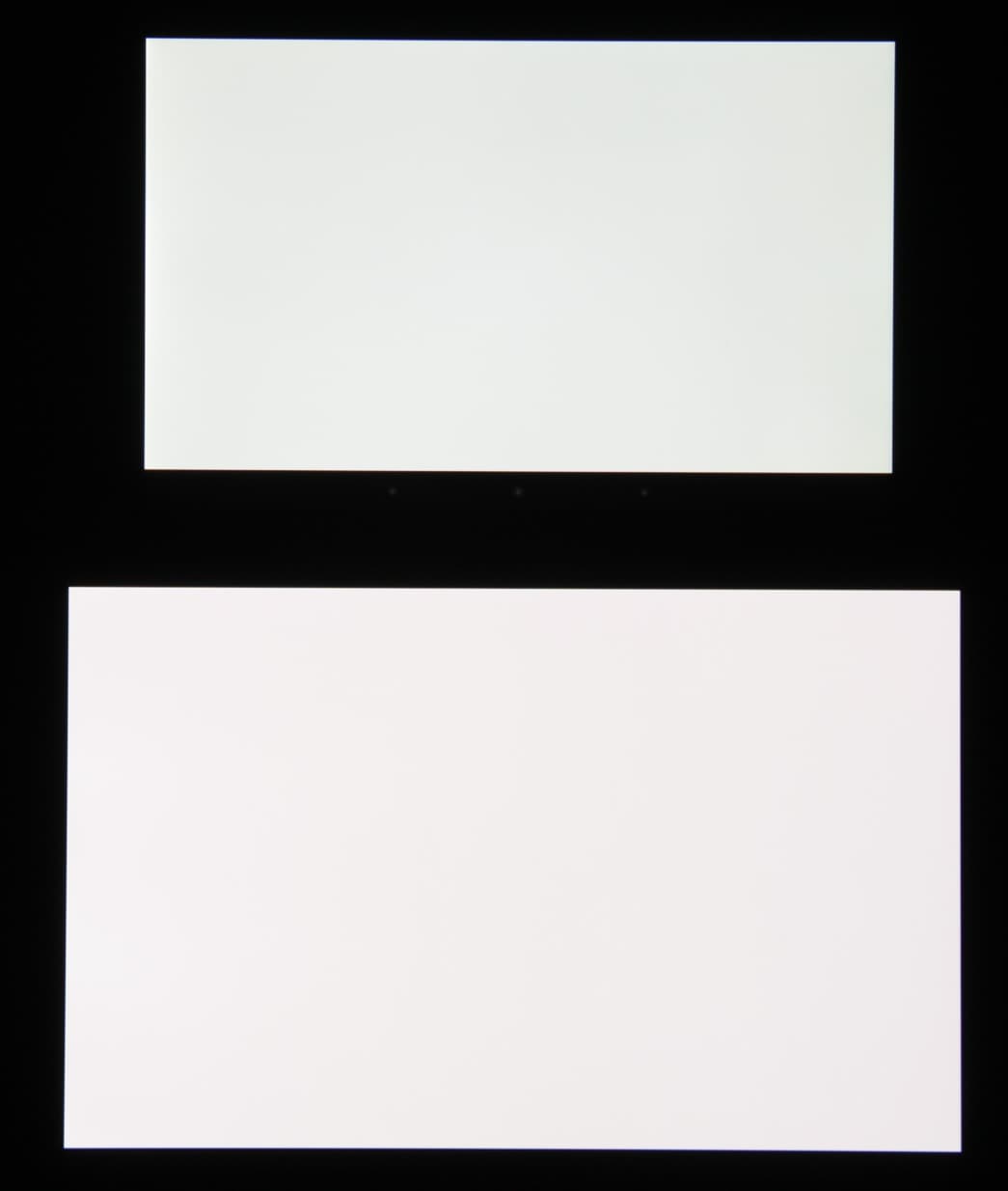 Экран характеризуется великолепными углами обзора, правда белый цвет при отклонении на большие углы приобретает легкий сине-зеленый оттенок, но черный цвет — просто черный под любыми углами. Настолько черный, что параметр контрастности в данном случае просто неприменим. При перпендикулярном взгляде равномерность белого поля отличная. Для сравнения приведем фотографии, на которых на экраны Galaxy Tab S 8.4 и второго участника сравнения выведены одинаковые изображения, при этом яркость экранов изначально установлена примерно на 200 кд/м², а цветовой баланс на фотоаппарате принудительно переключен на 6500 К.