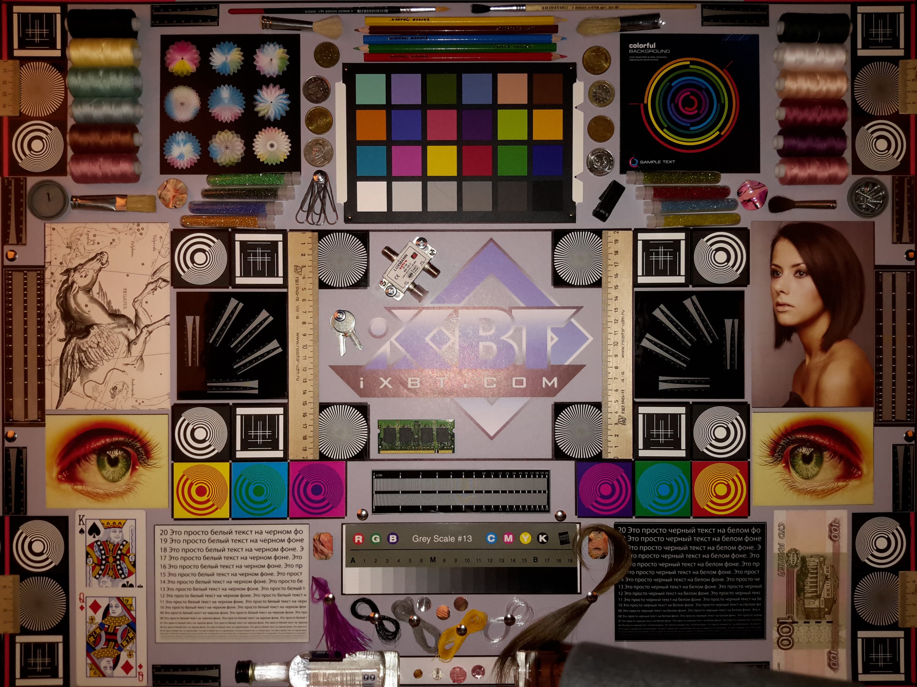 Яркость под углом у обоих экранов заметно уменьшилась (чтобы избежать сильного затемнения, выдержка увеличена в 2,5 раза в сравнении с предыдущими двумя фотографиями), но в случае Samsung падение яркости выражено гораздо меньше. В итоге при формально одинаковой яркости экран Galaxy Tab S 8.4 визуально выглядит гораздо более ярким (в сравнении с ЖК-экранами), так как на экран мобильного устройства часто приходится смотреть под небольшим углом. И тестовая картинка: