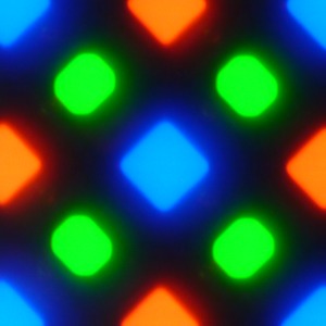 Расположение и форма субпикселей в этом варианте аналогична варианту в случае экрана Samsung Galaxy S5. Такой вариант PenTile RGBG лучше, чем старый с квадратиками красных, прямоугольниками синих и полосками зеленых субпикселей. Тем не менее, некоторая неровность контрастных границ и другие артефакты все равно присутствуют. Впрочем, из-за достаточно высокого разрешения они не сильно сказываются на качестве изображения.