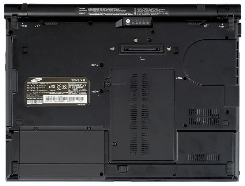 При взгляде снизу можно увидеть отсек жесткого диска, отсек модулей памяти, разъем порт-репликатора и индикатор зарядки батареи (для контроля зарядки необходимо нажать на сенсор, контроль можно производить и при извлеченной батарее).