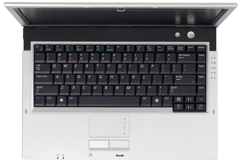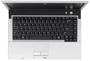 При открытой крышке ноутбук выглядит также просто, я бы сказал, подчеркнуто функционально. Серебристая "рабочая поверхность", над клавиатурой — вставка из перфорированной черной пластмассы, на которой выделяются две серебристые кнопки разного диаметра. Та, что больше — включение питания, поменьше — запуск системы AVStation Now. Здесь же под перфорацией размещены динамики.