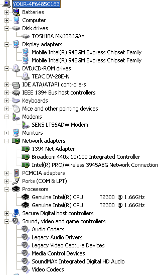Спектр устанавливаемых на данную модель процессоров весьма велик. Нам на тестирование попала модель, построенная на платформе Intel Centrino Duo, с тактовой частотой процессора 1,66 ГГц, встроенной графикой, небольшим на сегодняшний день объемом памяти DDR2 533, работающей в одноканальном режиме. Bluetooth отсутствует, как и гигабитный Ethernet. Устройство для работы с оптическими дисками — DVD/CD-RW Combo. Скорее, это работяга, а не представитель "высшего общества". Конкретные спецификации устройств, установленных на тестируемом экземпляре, можно увидеть на скриншоте вкладки Device Manager.