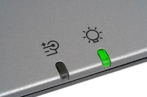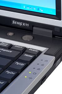Индикаторов состояния ноутбука всего два, расположены они слева в передней части ноутбука, правда, для того, чтобы увидеть их при закрытой крышке, придется наклоняться. Один индикатор отвечает за состояние электропитания (питание от сети — зеленый, заряд батареи — красный), другой — за режимы работы ноутбука. Индикаторы Lock`ов, активности устройств хранения информации и беспроводной сети расположены справа от клавиатуры. В целом, как я уже говорил, все просто и строго.