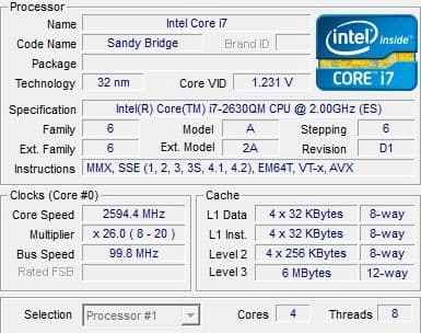 Итак, давайте посмотрим, что за процессор достался нам на тестирование. В соответствии с показаниями BIOS, в системе установлен Intel Core i7-2630QM с номинальной частотой в 2 ГГц. Официальную информацию об этом процессоре найти не удалось: на сайте ark.intel.com такой модели пока нет. Впрочем, кое-где информация проскакивала: это четырехъядерный процессор с термопакетом 45 Вт, номинальной частотой 2 ГГц и кэшем объемом 6 МБ. Он должен позиционироваться как самая младшая модель среди новых Core i7.