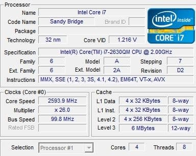 Количество ядер и потоков гипертрейдинга одинаковое у всех участников. Однако отличается тактовая частота: у 720QM она всего лишь 1,6 ГГц, тогда как новые процессоры работают на 2 ГГц. Предельная тактовая частота, правда, отличается не так сильно. Дело в том, что для 720QM указана частота, когда задействованы четыре ядра, а для 2630QM — когда задействовано одно. Если же у него загружены четыре ядра, то максимальная частота составляет те же 2,6 ГГц. Другими словами, в «разоганном» состоянии процессоры должны работать на одинаковой частоте (пока не сработает контроль температуры). Вот только в Sandy Bridge более продвинутая технология разгона Intel Turbo Boost, которая может дольше держать повышенную частоту, так что у него может быть преимущество. Но точно предсказать, как поведет себя разгон, невозможно, т. к. слишком много зависимостей от внешних факторов.