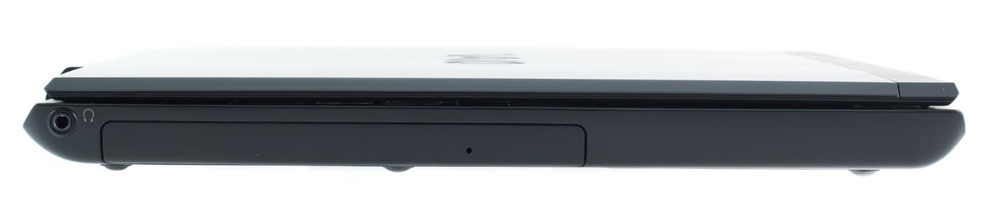 На левой грани расположен только оптический привод и, в самом дальнем уголке, — единый разъем для гарнитуры. И все! Таким образом, для всех портов расширения осталась только правая грань корпуса (заднюю не задействуешь из-за особенностей петли, открытый экран перекрывает к ней доступ). Обратите внимание, что кнопки выброса на приводе нет — она находится над клавиатурой. В работе это гораздо удобнее: кнопка под рукой, и не надо шарить по боковой грани ноутбука, чтобы ее найти.