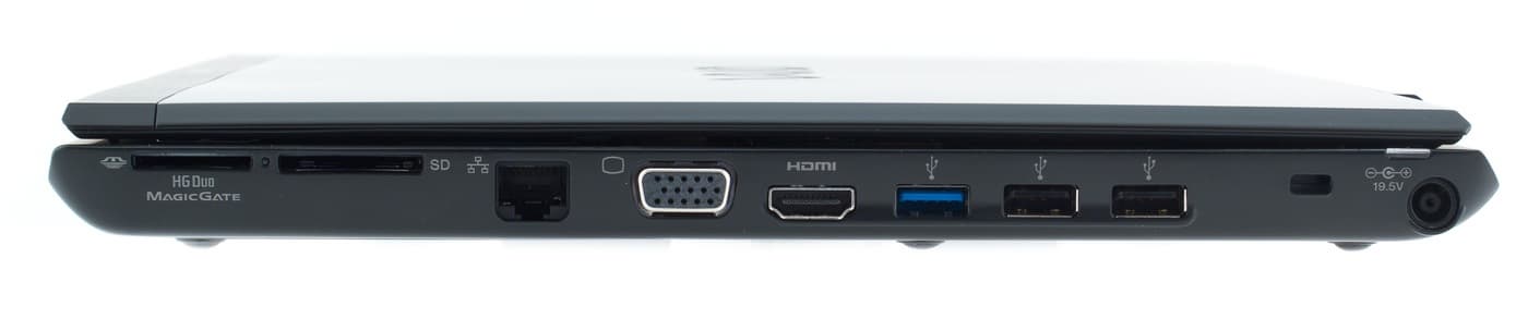 Итак, все разъемы расположены на правой боковой грани Sony VAIO SE. Слева направо: картоводы (отдельный для SD/MMC и отдельный для Memory Stick), разъем проводной сети, видеовыход VGA, видеовыход HDMI, три порта USB (из них один стандарта 3.0), выстроенных в ряд, порт замка Кенсингтона и разъем питания.